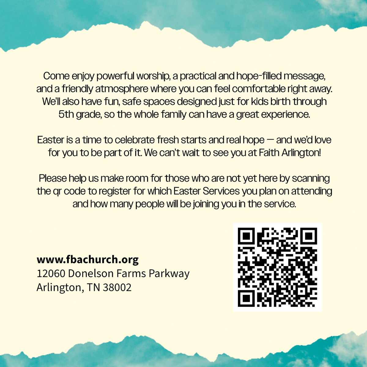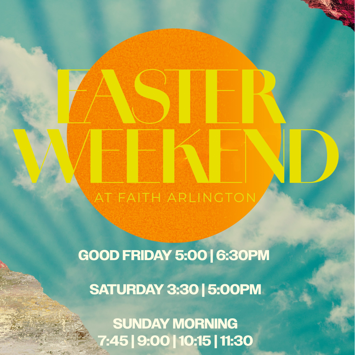 Come enjoy powerful worship, a practical and hope-filled message, and a welcoming atmosphere where you can feel comfortable right away. We’ll also have fun and safe environments for kids from birth through 5th grade, so the whole family can have a great experience. Don’t forget to stop by our Easter Photo Booth to capture a special family photo! Easter is a time to celebrate fresh starts and real hope — and we would love for you to be part of it. We can’t wait to see you this Easter at Faith Arlington!
